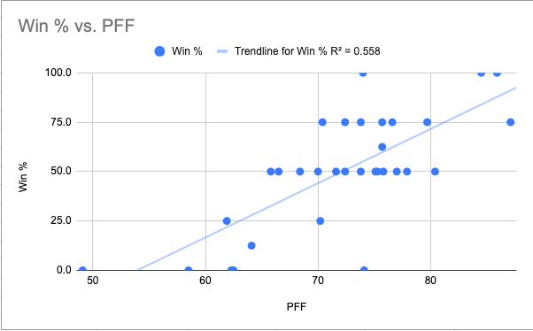 So far, through the first four weeks of NFL action, there has been a fairly strong correlation between PFF grades and win percentage: