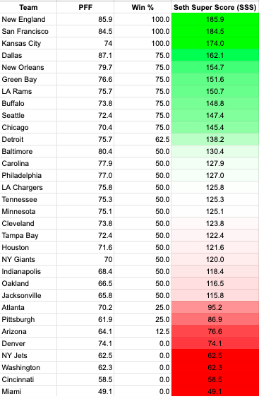 Alright, that’s enough of this smokescreen. The preseason of SSS is over and now it is time for the big reveal. I calculated each team’s SSS by taking their PFF grade and adding it to their win percentage. Take New England for example. At 85.9 in PFF and 100% in win percentage, they have a 185.9 SSS grade. They are first on the list: