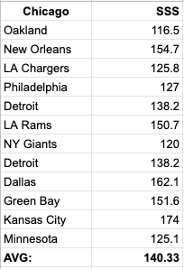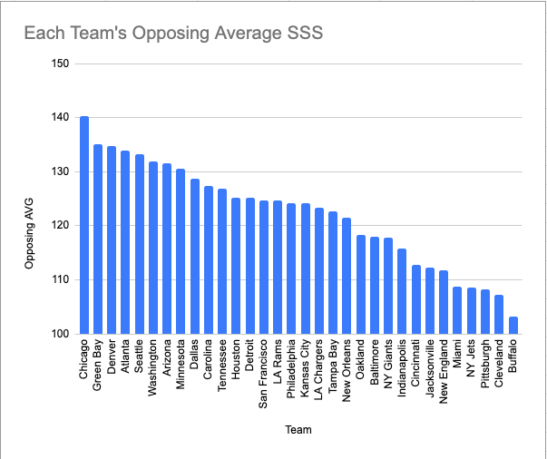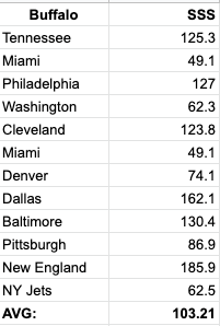 The Opposing Average SSS mean came out to about 122.25. Tampa Bay has the most average schedule the rest of the way as they are at 122.58. The lower your Opposing Average SSS is, the better. Expect a lot of tables to be smashed as the Bills charge on through their fairly easy schedule. Here is each team’s Opposing Average SSS: