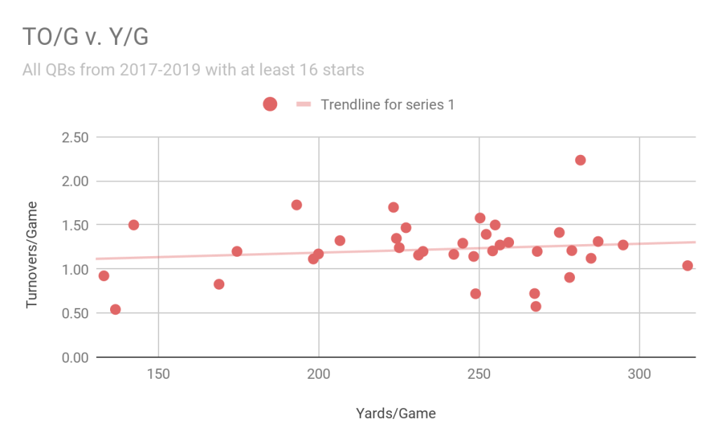 Jameis Winston might be the most entertaining quarterback in the league due to his mixture of big-time throws, head scratching picks, and gumpy scrambles. Out of all QBs since 2017, Jameis has the most turnovers per game with 2.24, but he also has the fifth most yards per game with 281. It is very easy to find Jameis on the graph below (hint look at the crazy dot in the top right), but that’s Jameis – he likes to stand out. Through 10 games this season Jameis already has 18 interceptions, tying his career high. He’s also averaging a whopping 307 yard per game this season, which would also be a career high by a wide margin. Bruce Arians has failed to bring out the Andrew Luck inside of Jameis, instead Flameis doubled down and is having his most Jameis season yet.