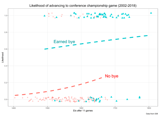 Picture this if you are the New Orleans Saints: You lose the NFC Championship game because of a pass interference call not being able to be reviewed, you argue for a rule change, it happens and you just need the Seahawks to knock off the 49ers to get a bye and when you need that rule to come into play the most as the Seahawks are driving and about to score, the review never happens and the 49ers win making New Orleans play four games to win the Super Bowl. This chart made by Ben Baldwin truly shows how hard it is for a team off a bye to make their conference championship game: