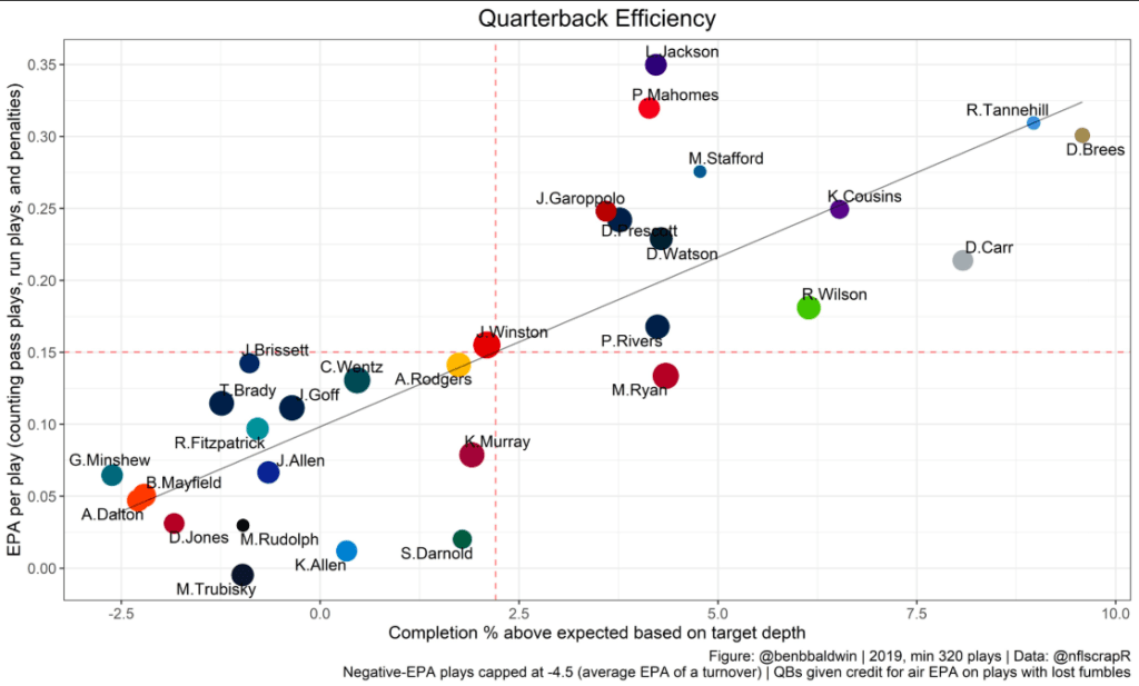 This article has now become the breeding grounds for the Ryan Tannehill fan club. Who leads the NFL in Yards per Completion at 13.6? Ryan Timothy Tannehill. How about the leader of Adjusted Net Yards Per Pass Attempt (ANY/A)? Ryan Tannehill. Who are the only two quarterbacks with a completion percentage above 70% and a touchdown percentage above 7%? Future first-ballot Hall of Famer Drew Brees and (future Hall-of-Famer?) Ryan Tannehill. Tannehill has been given the fifth most amount of time to throw by his offensive line and has made the most of it. His Average Air Yards to Sticks (the number of yards thrown past the first-down line) is second in the NFL at 0.6. Tannehill is throwing deep and making the most of it – as he also leads the NFL in Completion Percentage Above Expectation at 8.1%. Another chart made by Ben Baldwin shows how good he truly has been: