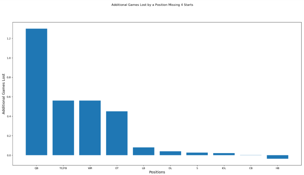 This graph shows how many more games a team would lose, on average, if they lost a starter at a given position missed exactly 4 games. For example, if a team had a starting quarterback miss 4 games they would, on average, lose 1.3 more games than they would otherwise over those 4 games.