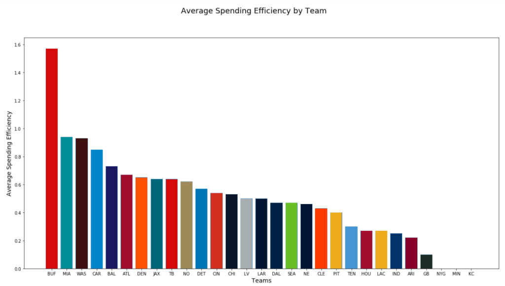 The largest contribution to the Cardinal’s score is the acquisition of All-Pro WR DeAndre Hopkins while also managing to shed David Johnson’s terrible contract. The model absolutely adores that move. It also loves the astoundingly cheap contract give to starting OT Justin Murray at less than a $1 million. Even if Murray doesn’t start for the Cardinals next season the model still loves the contract. Unfortunately, as much love as there is for these two contracts, it hates the large contracts given to starting RB Kenyan Drake and starting DL Jordan Phillips. This is a case where classic football understanding and the model disagree, as the Cardinals were much more efficient with Drake on the Field and had an awful run defense. Even with those facts, it appears that it would’ve been ideal if the Cardinals would have spent those resources elsewhere.