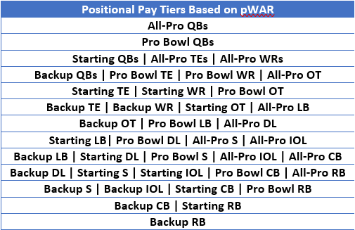 From here we can create a framework of how to value free agents with a core assumption: between any two players of equal quality, the player at the higher pWAR position should be paid more. Additionally, it is a small logical leap to say players of an All-Pro quality should be paid more than those of a Pro Bowl quality, which should be paid more than starters, which should be paid more than backups. From here we can make a tier system of paying players: