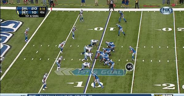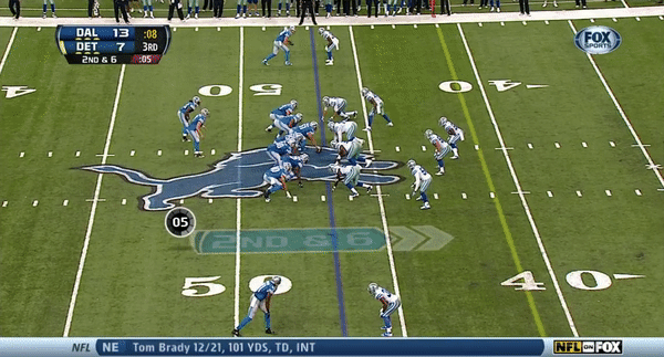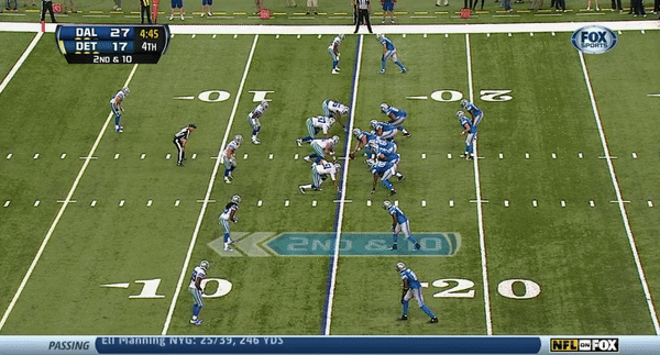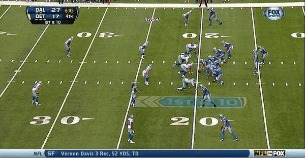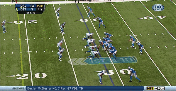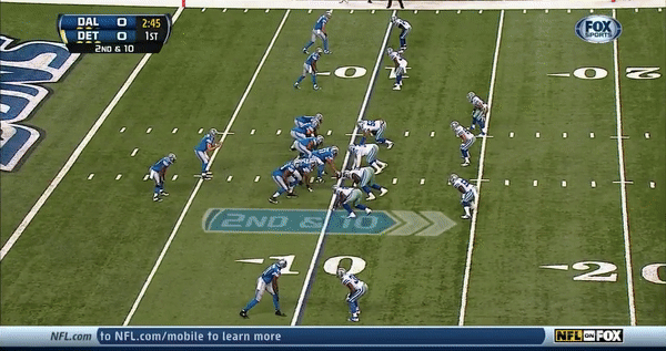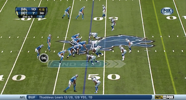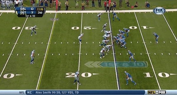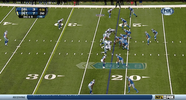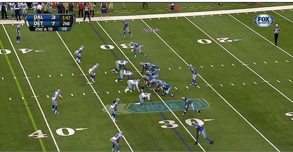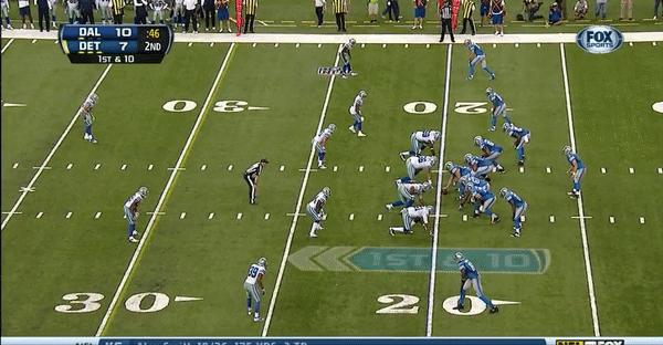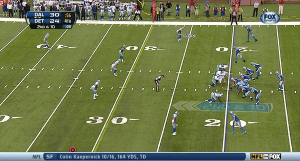 It should not be fair for a 235 pound man to be running that fast but he bursts off the line and when he reaches 7 yards into his route, the other Lions receivers running at full speed are only 4 or 5 yards into theirs. Calvin settles into a soft spot in the Cowboys’ zone for a 21 yard gain.