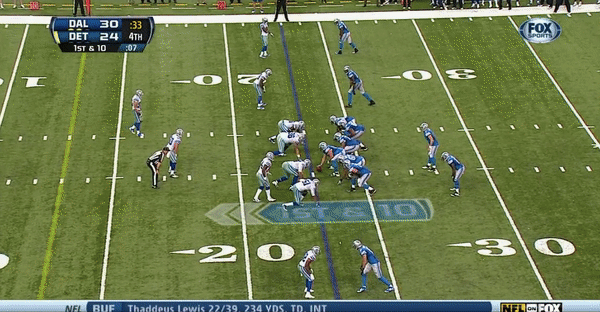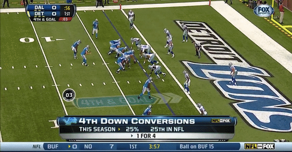 Calvin Johnson’s only touchdown of the day wasn’t flashy but it was a 4th and goal and he came up clutch. The Cowboys had the great idea of single-covering the best receiver in football in the red zone without help and that allowed him to run an easy slant for the score.