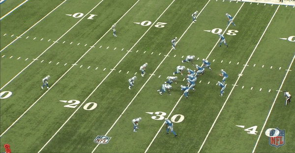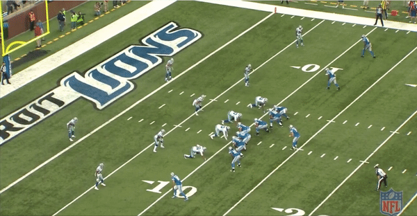 At the beginning of the route, Calvin gets pushed off his line making him almost run into his teammate (seen on the all-22 film below) but still outruns everyone down the field and makes a beautiful over-the-shoulder catch for his second straight reception and puts the Lions in prime scoring territory