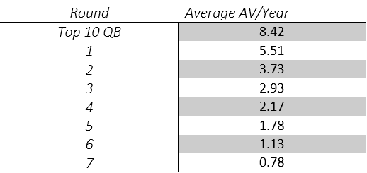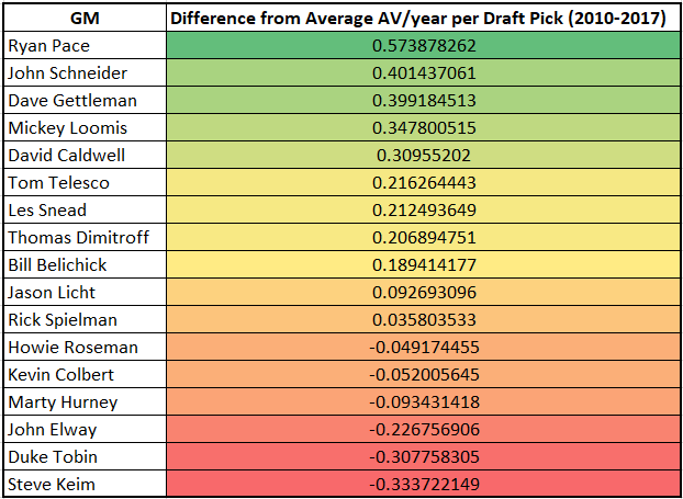 What about the expectation issue? To get around this issue I averaged the AV/year of all players drafted by round between 2010 and 2017. I then observed the difference between every player selected by the above GMs between 2010 and 2017 and got the average difference for their picks over this time span and ranked the GMs accordingly. An extra category was made for QBs drafted inside the top 10 picks as they have higher expectations than usual.
