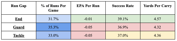 In every statistical category, whether it’s EPA/run, success rate or yards per carry, rushing outside of the tackles (aka the “end” gap) has proven to be the best despite being utilized the least. Looking at year-by-year splits of success rate, runs through the end gap have been 6% more successful, on average, than inside runs: