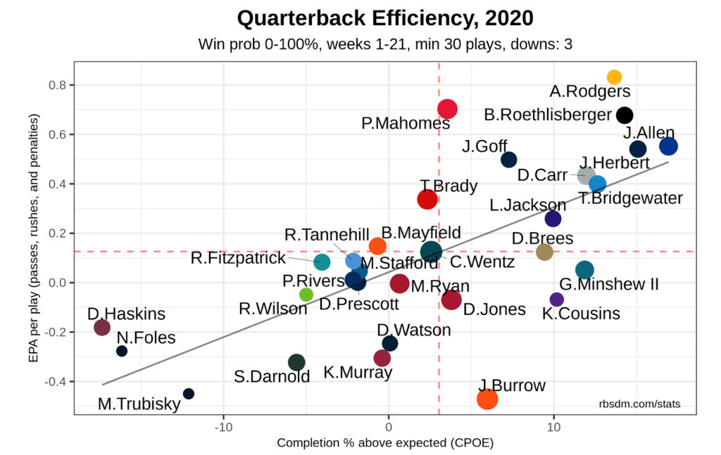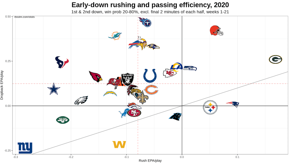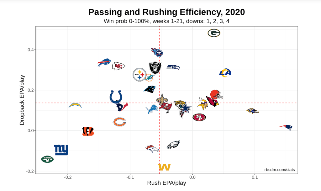 As seen by the graph, the Chargers have not been good offensively. Their run game has suffered due to the entire right side of the offensive line being out, and they have played 2 of the best run defenses in back to back weeks with the Bucs and the Saints (both are top 14 in rush yards EPA defensively). Justin Herbert has been a revelation at QB and a clear candidate for OROY, but the pass game has been average due to inconsistent playcalling.