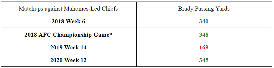 Tom Brady has had 3 games over 300.5 passing yards out of 4 matchups against a Mahomes-led Chiefs team (75%):