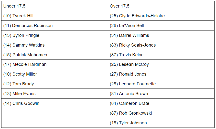 Reasoning: The past year the Chiefs have had under 7.5 players with a reception in 50% of their games (including playoffs). However once we look at how Andy Reid and Mahomes have distributed the ball over the last 3 seasons and particularly in the playoffs the under looks much better. The under has hit in 61.8% of all Chiefs games from the 2018-2020 seasons including playoffs. And when looking at just the playoffs the Chiefs have had: 5, 7, 8, 6, 6, 6, and 6 players with a reception with 6 of their 7 games hitting the under. In the big games Andy does not take out his best players and Pat throws it to players he trusts. I expect the trend to continue, meaning lots of hill and Kelce targets and the under hitting.