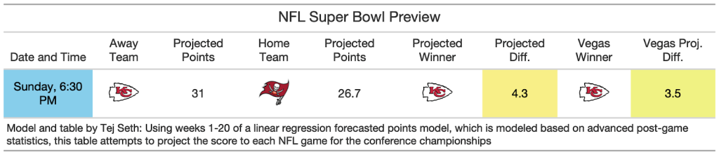 Reasoning: With many expecting this Super Bowl to be a shootout, it’s important to take things into perspective and look at Brady’s track record in his large sample size of Super Bowl appearances, this season with the Buccaneers, and his head-to-head matchups against a Mahomes-led Chiefs team.