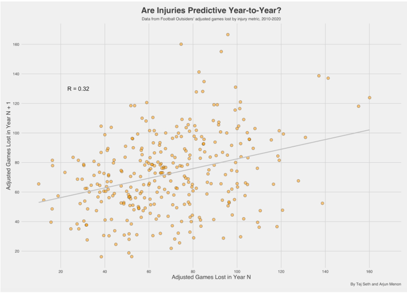 When looking at a sample from 2010-2020, it showed that injuries are slightly predictive from year N to year N + 1. There are a couple reasons why this could be the case. In the NFL, some teams do a better job of treating injuries and helping players recover than others. You also have teams like the Chargers who accidentally stab their starting QB’s lung 15 minutes before the game and injure them for three weeks. A good medical staff can help players to heal quicker from soft tissue injuries to places like the hamstring, quadriceps, biceps, and achilles. However, it is tough for medical staffs to prevent bone breaks/fractures as those are freak injuries and can be hard to predict.