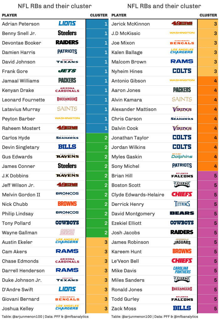 This is a PCA cluster analysis of every running back and the cluster they’re in. There are a couple names missing due to spacing issues, but this contains the running backs that had over 80 attempts per PFF.