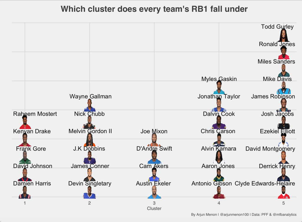 - Cluster 2: It is fair to say that this cluster contains guys who can break a run for 30+ yards or get stuffed behind the line of scrimmage. There are uber efficient RBs like Nick Chubb and Gus Edwards, as well as less efficient RBs like Melvin Gordon II and James Conner.