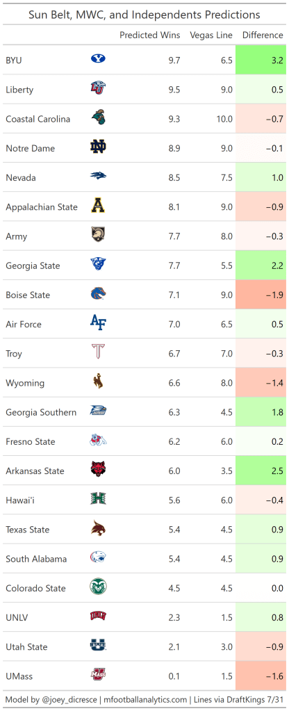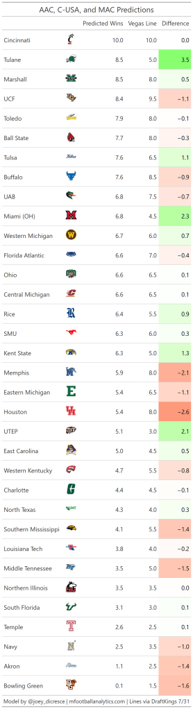 The model sees value in a lot of Group 5 teams. The team with the largest difference between projected wins and Vegas line is Tulane. My model project Tulane to win 8.5 games while their total is only set at 5. Tulane’s offense was great in 2020, leading the AAC in EPA and success rate. Tulane’s offense is well balanced, but their run game in particular is excellent. In 2020 Tulane’s EPA per rush of 0.178 was good for 5th out of all FBS teams.