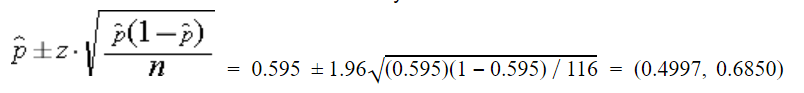 Really though, the model getting 59.5% (69 correct, 47 incorrect, 6 push) of over/under picks correct for its 2019 predictions is encouraging. While the accuracy for predicting the exact number of wins may not be where I’d like, being directionally correct in picking a side is important. However a sample of 122 bets is not enough to declare myself sharp. I constructed a 95% confidence interval for the accuracy rate of the model.