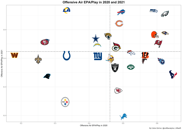 Let’s take a deeper dive into exactly what Wilson can bring to what has been a relatively stagnant offense. In 2020 and 2021 the Seahawks passing offense ranked 7th and 2nd in terms of air EPA. The Denver Broncos ranked 10th and 16th, both behind the Seahawks. Based on this, the Broncos could see a considerable improvement in regards to how the passing offense could help to increase their total EPA.
