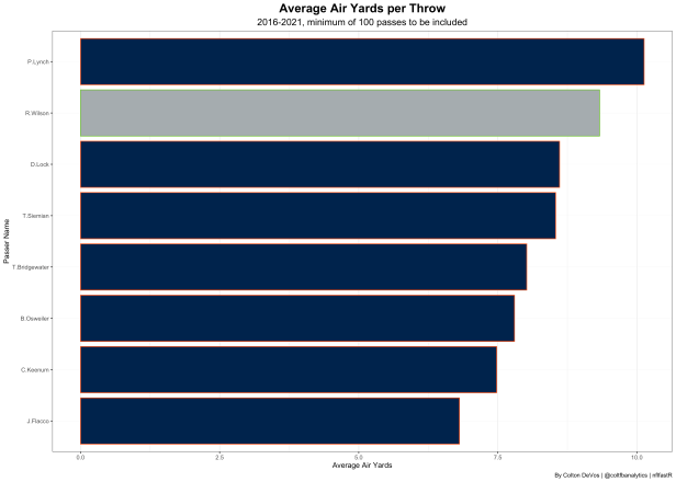 Another way in which Wilson improves their offense is through his aggressiveness. Throughout his career he has been known as someone who pushes the ball deep and generates big plays. If we look at Wilson’s average air yards per throw you can see he is considerably higher than almost all of the Broncos QBs from the past 5 years. Only Paxton Lynch is higher.