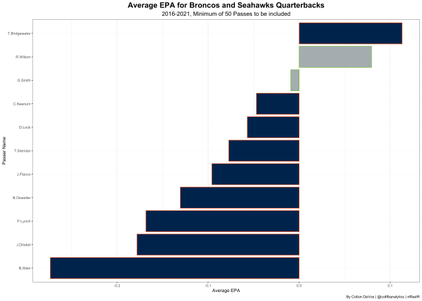 Finally Russell Wilson can contribute to a higher EPA. Over the last 5 seasons he has had an average EPA of 0.07 while the QBs for the Broncos, except for Teddy Bridgewater, have had a negative EPA. All in all, the trade seems to have very positive implications for the Broncos offense that has really struggled to find consistent QB play and QBs that can help them win games.
