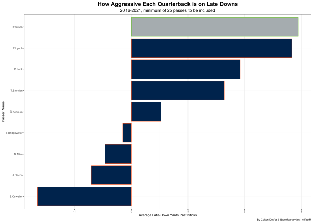 On Tuesday the Seattle Seahawks decided to trade Russell Wilson and a 4th round pick to the Denver Broncos in exchange for Shelby Harris, Drew Lock, Noah Fant, two first round picks, two second round picks, and a fifth. In this article we will be looking at what the implications of this trade means for both teams and their plans going forward. How aggressive a QB is on third and fourth down was calculated by taking air yards minus yards to go.