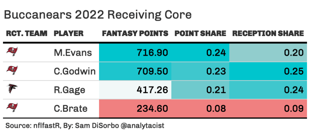 Russel Gage had a breakout season in 2021 with the Falcons and seemed to have the potential of becoming a star fantasy receiver–this was, of course, before he was moved to Tampa Bay. Last year, in the absence of Calvin Ridley, Gage was able to pull in a large number of targets and account for a good amount of the receiving core’s fantasy points. Now, behind star receivers Mike Evans and Chris Godwin, who have scored a combined 47% of Bucs receivers’ fantasy points the past 3 years, it is going to be difficult for Gage to produce enough volume to be used as much more than FLEX option in 2022.