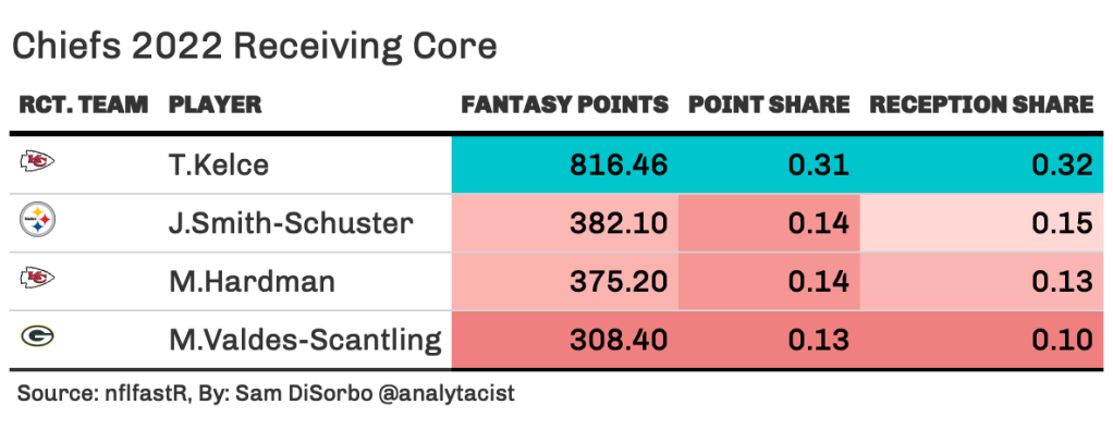 Last, and likely least, we have JuJu Smith-Schuster who was moved to the Chiefs this offseason. I can’t argue that there isn’t any upside to his new position, as he will have Patrick Mahomes slinging him the ball as a WR1 in his new threads. However, Smith-Schuster has had trouble pulling in receptions when facing intra-squad competition, as we have seen with his 15% reception share on the Steelers (competing with Dionte Johnson and Chase Claypool). Now, lining up next to Kelce, a ball-hawking TE1, JuJu might have trouble finding targets, especially as Hardman and Valdes-Scantling will likely look to fill Hill’s role as a deep threat next season.