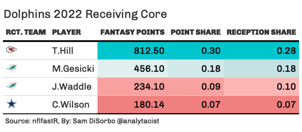 Tyreek Hill pulled in a large percentage of targets in the past three seasons and put up an outstanding amount of points in this time, which netted to be 30% of the points scored by Chiefs receivers in this time. At first glance, it appears that Hill’s new squad will be a great fit for him as the Dolphins’ returning receiving corps only grabbed 28% of receptions–this, however, is before we factor in Devante Parker, who grabbed 18% of the receptions during this time while battling through injuries. What we can take away from this is that the Dolphins love to spread the ball out. A dominant WR1 like Tyreek Hill may not perform as well as he typically does in a Dolphins offense in which he may not take 28% of the receptions, especially when competing with Jaylen Waddle, who will only become more of a popular target for Tua as time progresses. Hill will also be dealing with a serious QB change–while it may be trite to criticize Tua for his weak arm, there is no question that a switch away from one of the best QBs to ever play the game might have a negative impact on the deep threat receiver.