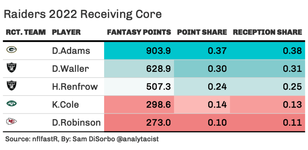 Next, let’s take a look at Hunter Renfrow. Renfrow has pulled in quite a large percentage of the receptions for the Raiders in the past three seasons, but his fantasy performance is slightly lacking, as he has only put up 507 points despite his high usage rate. With the addition of superstar Davante Adams, there is much less room for Renfrow to succeed. Adams accounted for 38% of the receptions in the past three years in Green Bay, and will likely continue to haul in the majority of the load in Vegas. As Renfrow now stands in the shadows of both Waller and Adams, we can expect his fantasy output to be lower than expected.