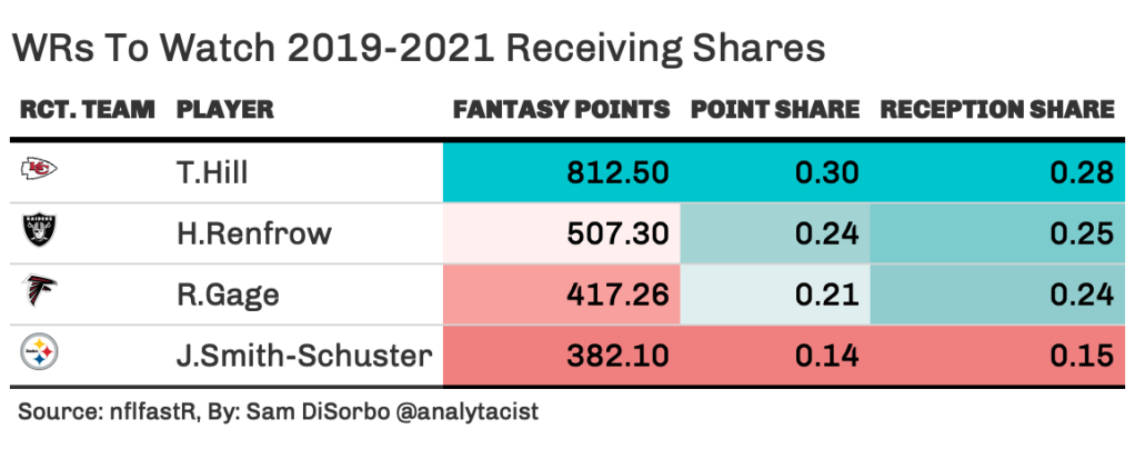 Below you will find a table outlining the aforementioned WRs ‘receiving shares’ from 2019-2021. It highlights each player’s total fantasy points scored, percent of fantasy points scored amongst WR/TEs on their team (point share), and the percent of receptions they held amongst WR/TEs on their team (reception share).