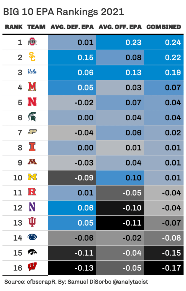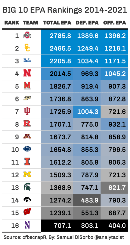 With the new addition of USC and UCLA, let’s take a look at how they square up against the other BIG 10 teams. The table below shows the (new) BIG 10 EPA (expected points added) rankings from 2014 to 2021–it looks like the two newbies fit in just fine. Ranking 2 and 3 amongst the conference in total EPA the past 7 years will definitely throw them right into the mix.