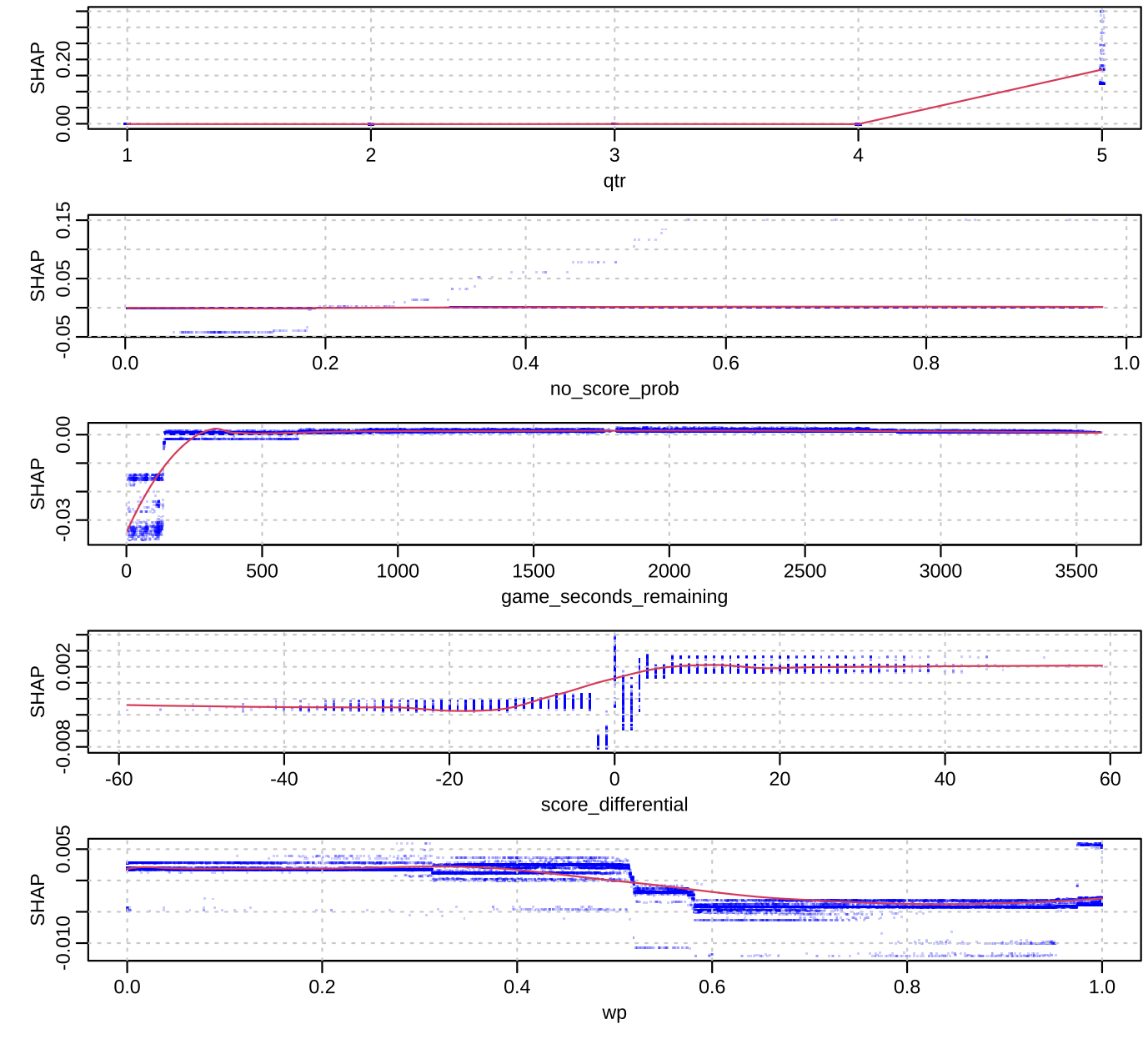 Below we can see which metrics were most influential for each piece of the model–you’ll notice they are mostly the same stats but in varying order. The first slide shows metrics for the ‘go for it’ sector of the model, the second for the punt sector, and the third for the FG sector. It is no surprise that quarter trumps all, as the later in the game we get, the more effect a fourth down decision can have on the game.