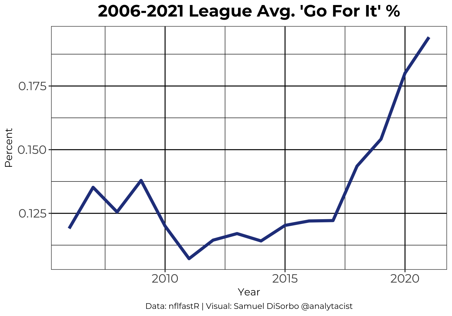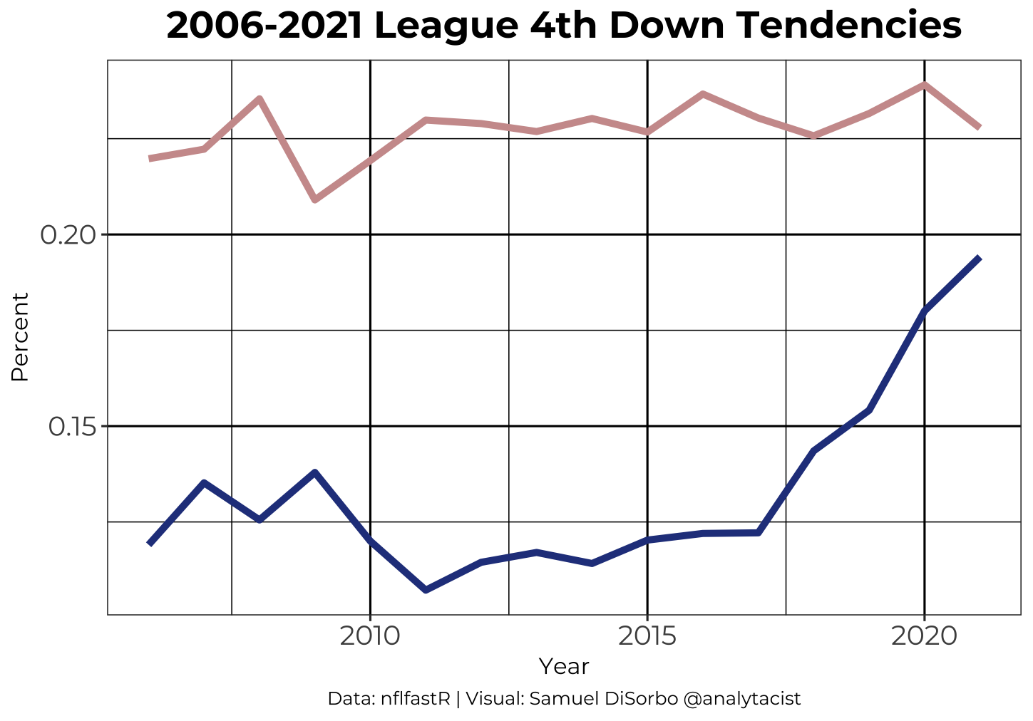 It may not come as a surprise to many that the NFL has become increasingly aggressive on fourth down in recent years. Since 2017, there has been a massive uptick in ‘go for it’ percentage, which coincides with the analytics movement that has been growing since then. Fourth down field goal attempt percentage has stayed relatively consistent (pink line), while punt attempt percentage has taken a massive drop. Down around 14% since 2006, punting is becoming less favorable in the minds of NFL head coaches. This is hard evidence that the league is adapting, in part to advanced analytics!