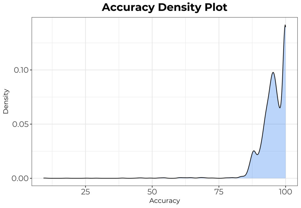 One area STALEY definitely can be improved in is its accuracy scores. They are a bit diluted because I had to deal with calculating percentages with negative values and didn’t think a percent difference score would suffice. Because of this, I had to scale the data to make it possible, which made the outcome a bit lopsided, as you can see below. Regardless, we can see that teams are very fairly accurate with their decisions. This does mean, however, that small differences in accuracy are more meaningful.