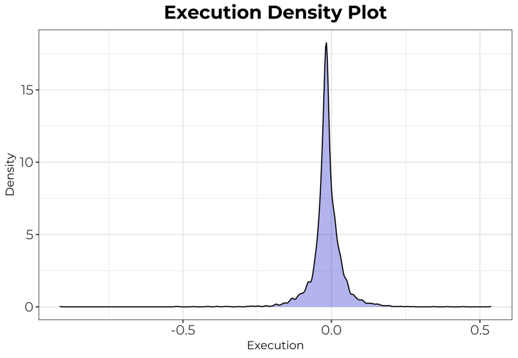 The execution density plot is somewhat normal, and it makes a lot of sense that most fourth downs have net 0 execution, as teams are generally accurate with their decisions and average with their play executions (not over or under performing).