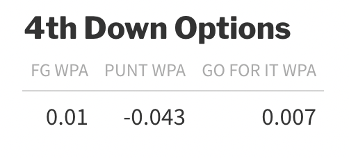This table will highlight the team decision, the game situation, STALEY’s predictions for WPA for each decision, and of course, the accuracy and execution of each choice/play (notice how most of these are plays where they went for it, and how high the accuracy of these decisions are).