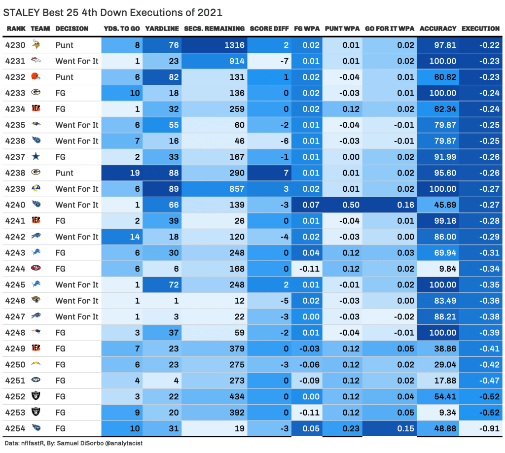 Let’s take a look at what STALEY thinks about some of last season’s fourth down decisions. Before you look at the top 25 executed fourth down plays of 2021 (ranked by STALEY), let me shed some light on a couple of metrics: