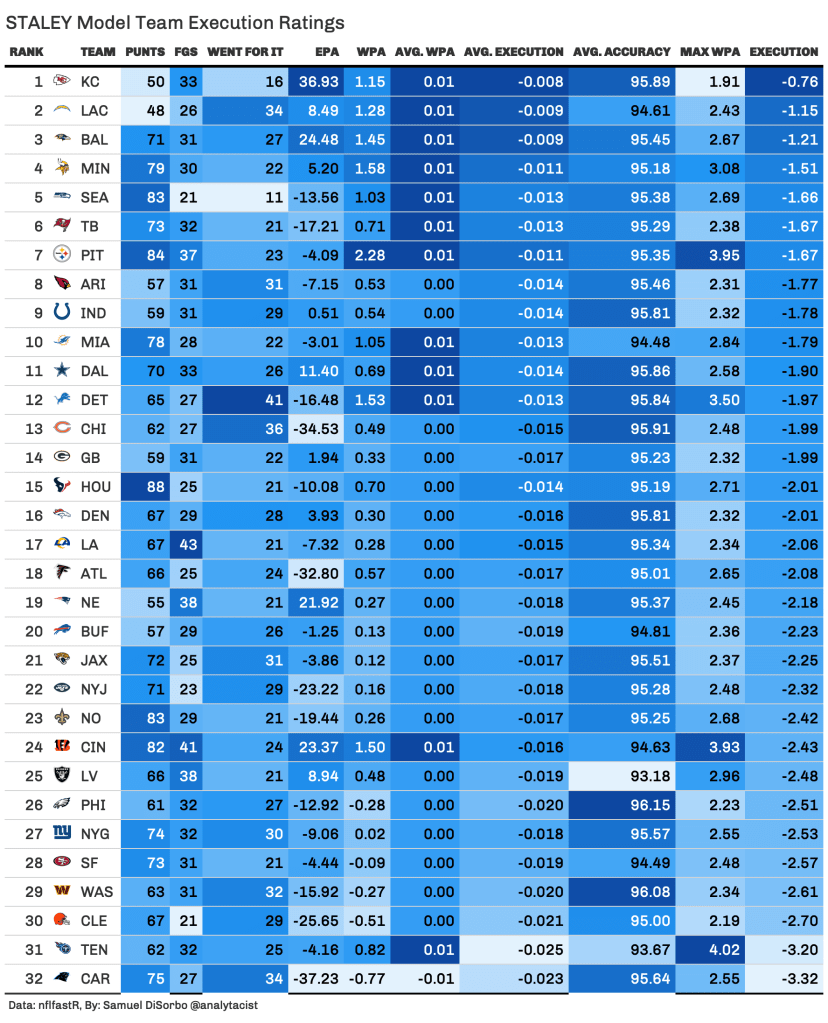 Last but not least, here are the STALEY model team rankings by total execution in 2021. As you’ve probably guessed by now, the Chargers (backed by head coach Brandon Staley) are second on the leaderboard, which helped inspire the name of this model!