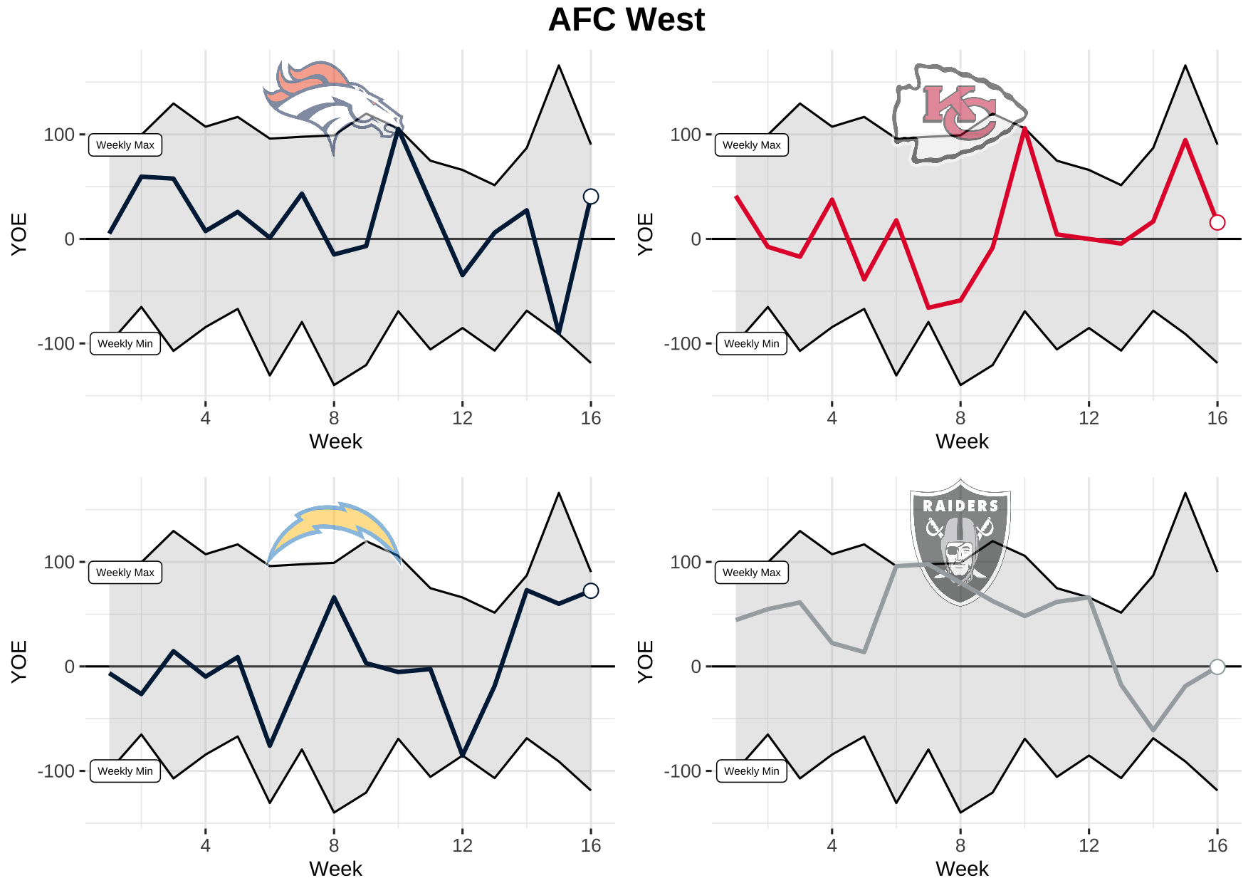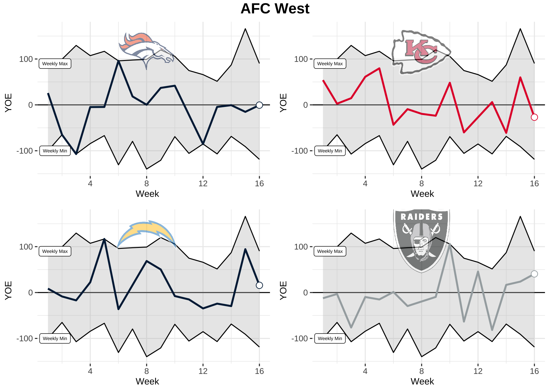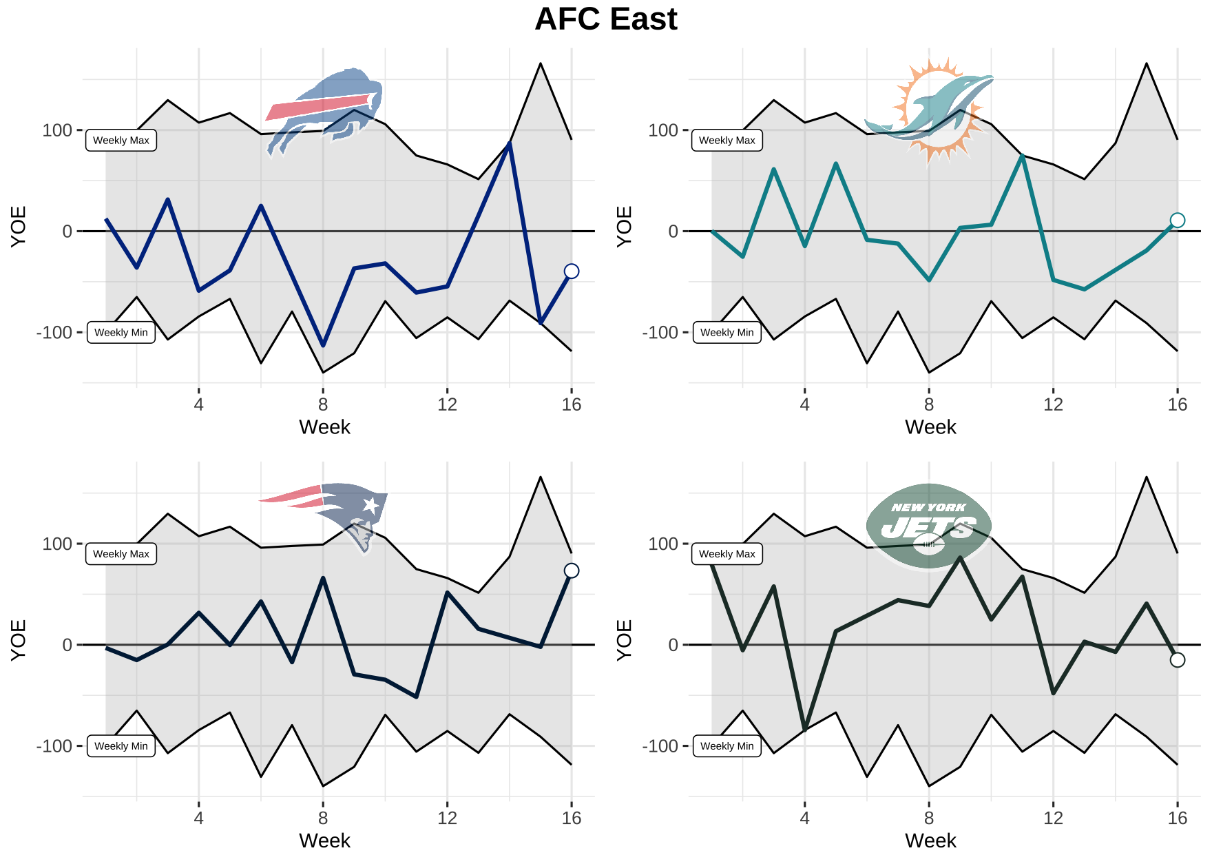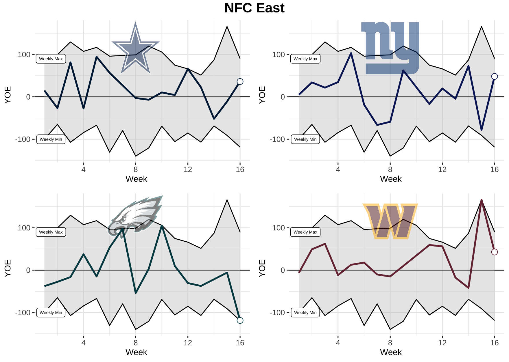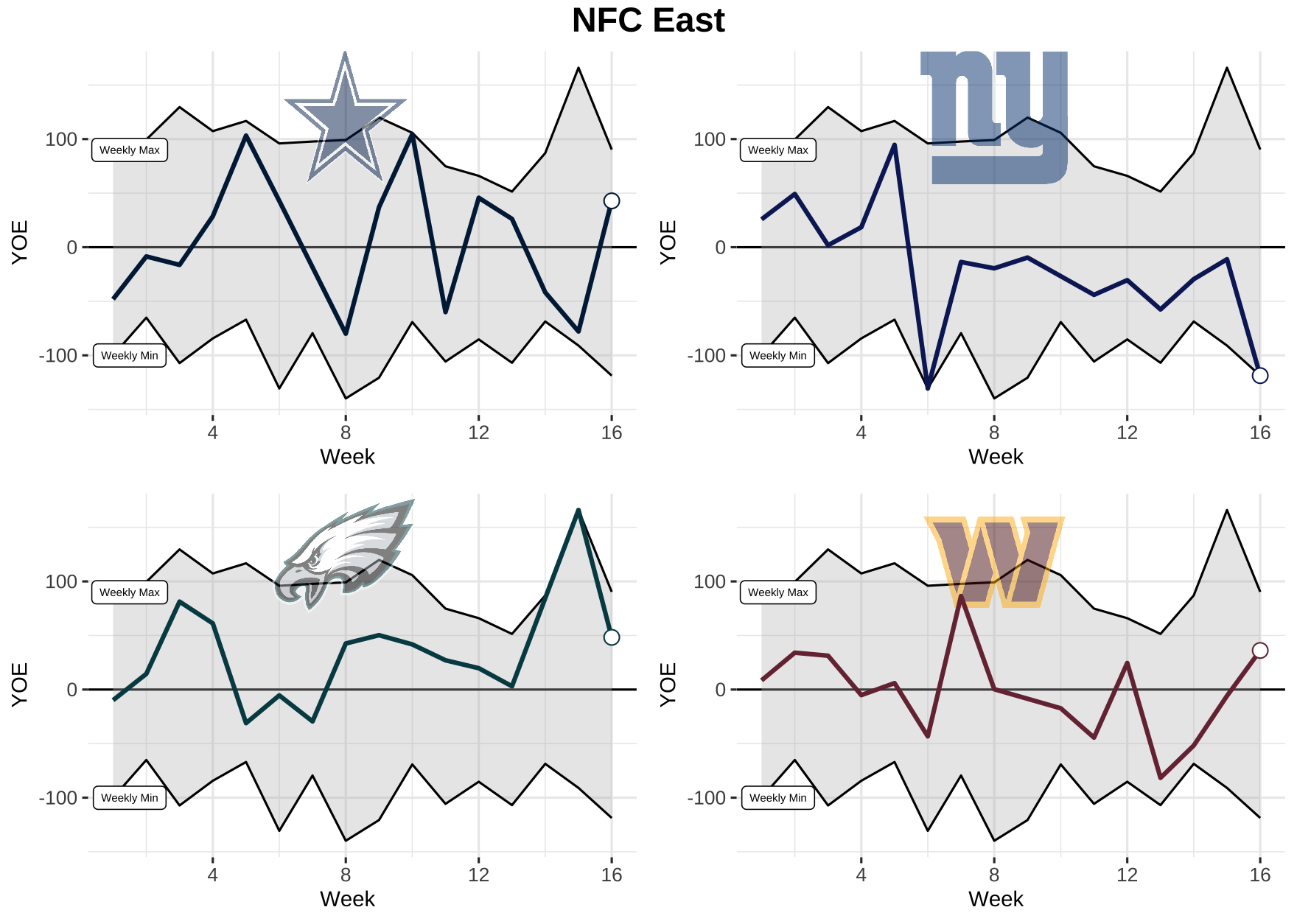 Now that we know what we’re dealing with, let’s take a look at each team’s weekly performance for total YOE from 2021. Keep in mind, the top black line is the max YOE recorded for the week and the bottom is the min. The gray area in between is where every other team falls.