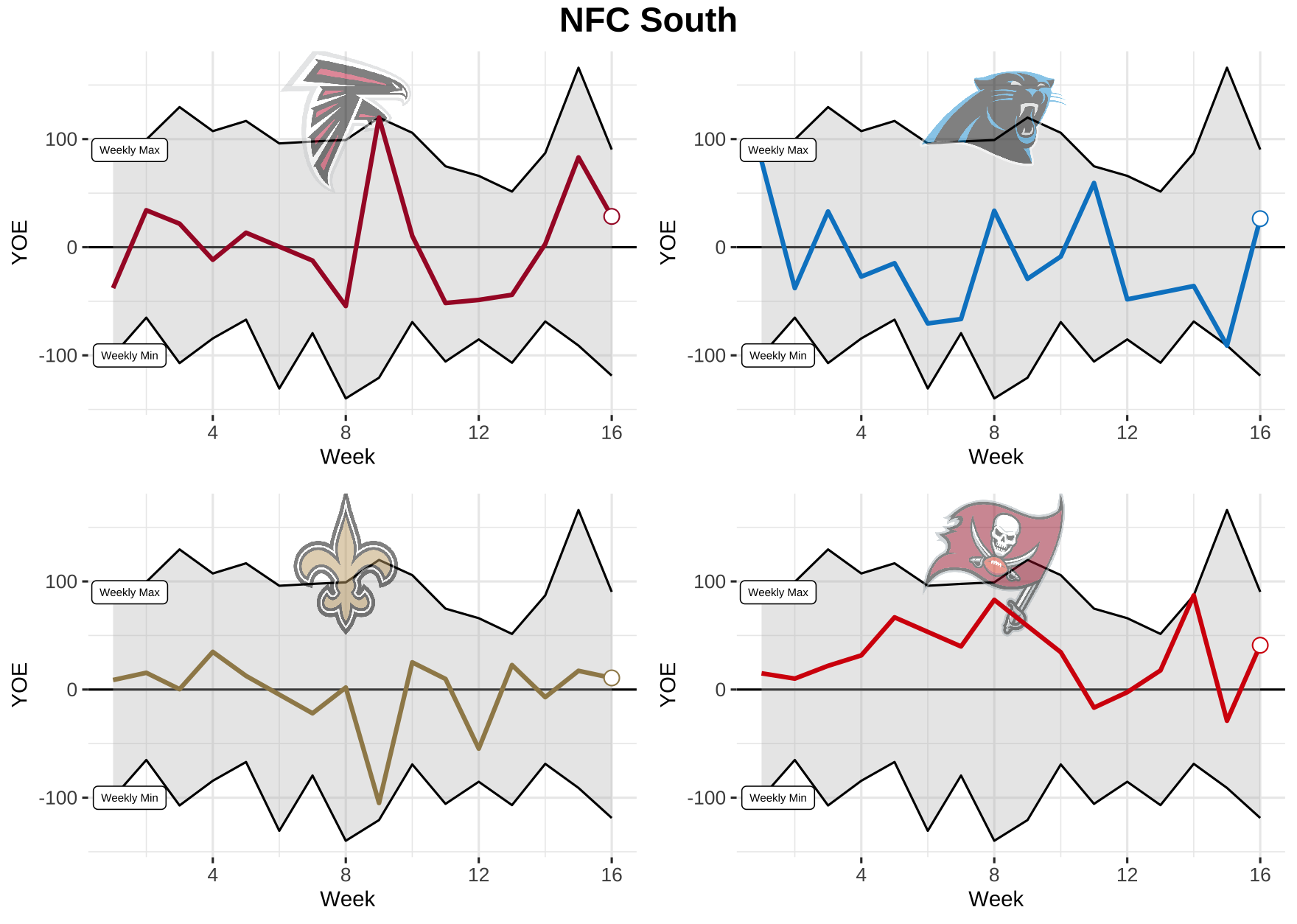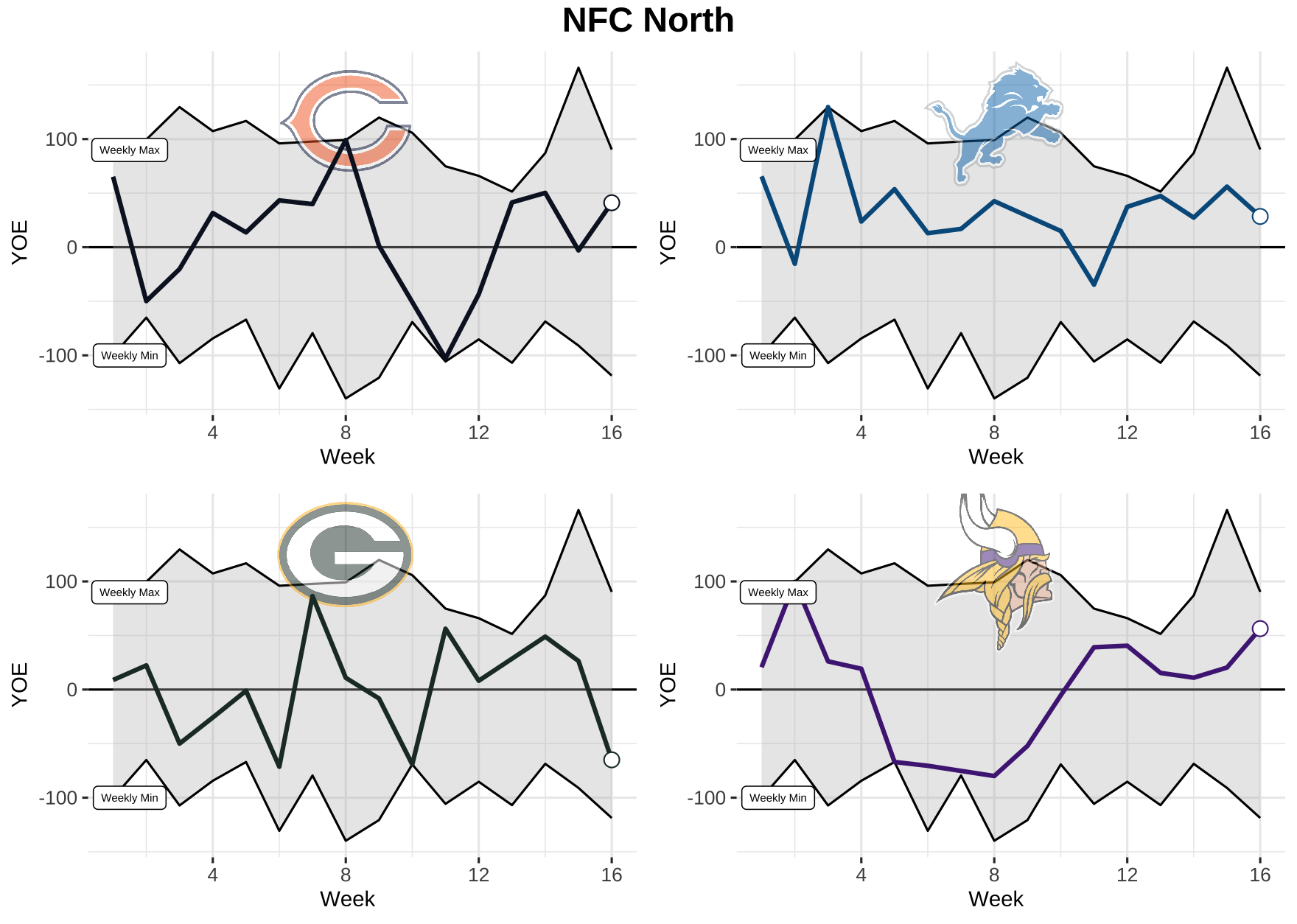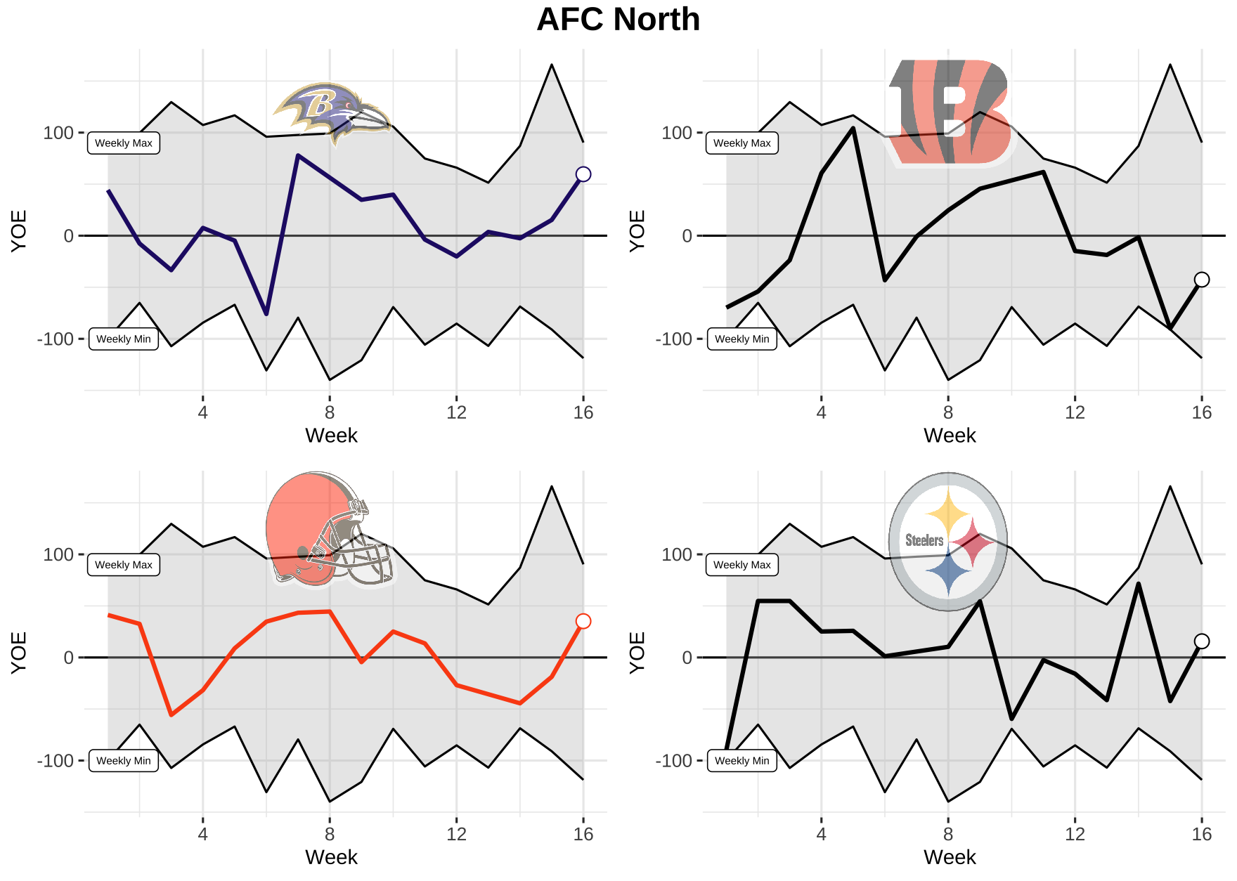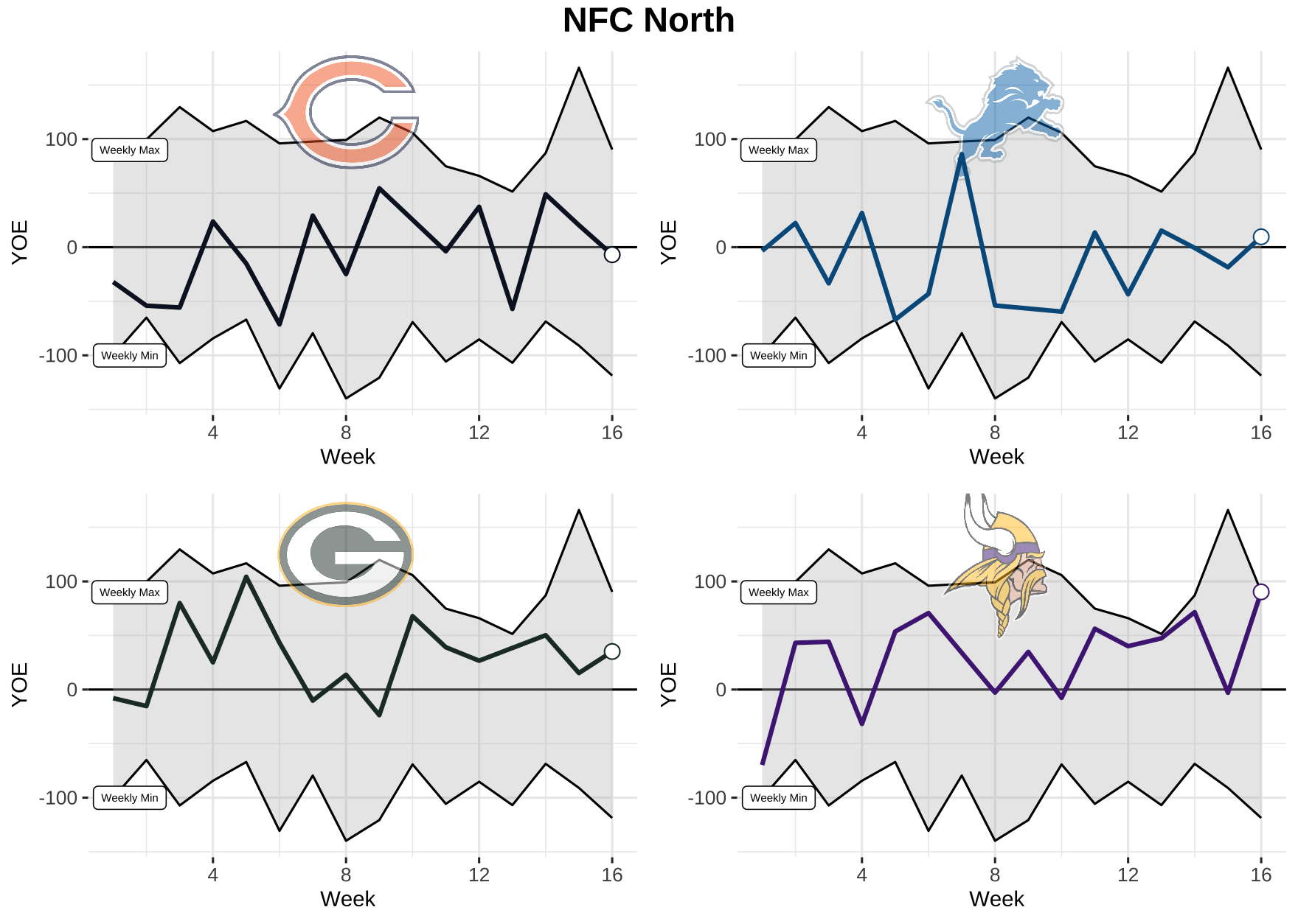 Now that we know what we’re dealing with, let’s take a look at each team’s weekly performance for total YOE from 2021. Keep in mind, the top black line is the max YOE recorded for the week and the bottom is the min. The gray area in between is where every other team falls.