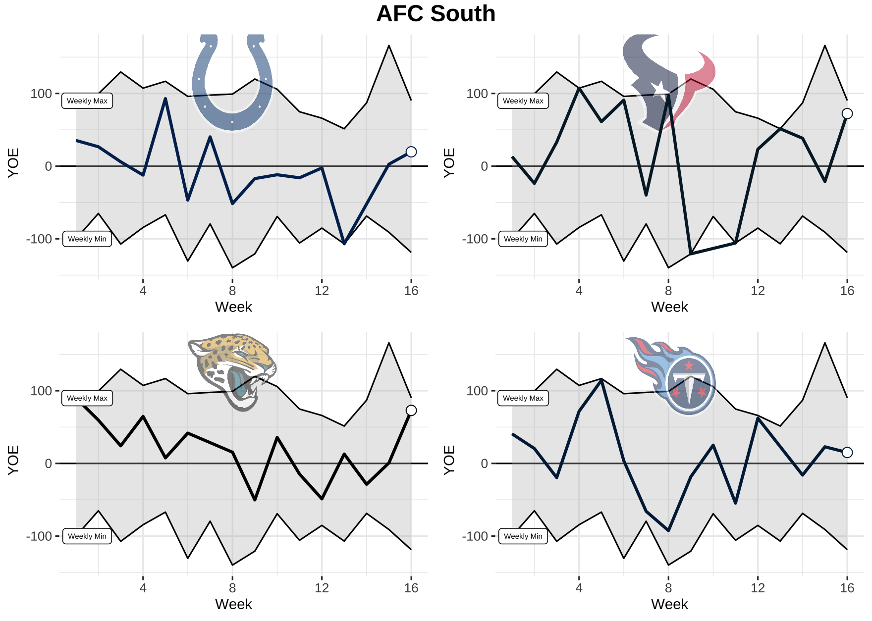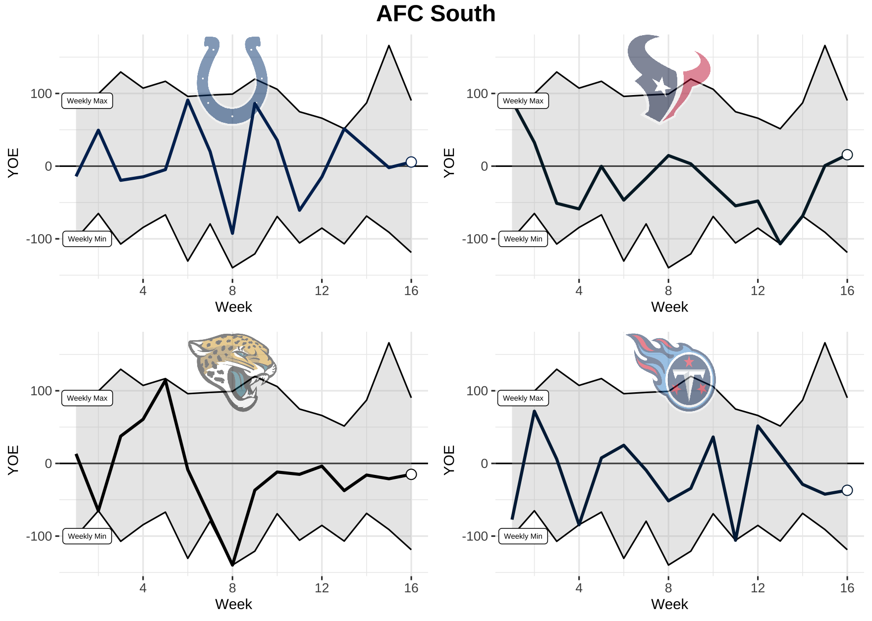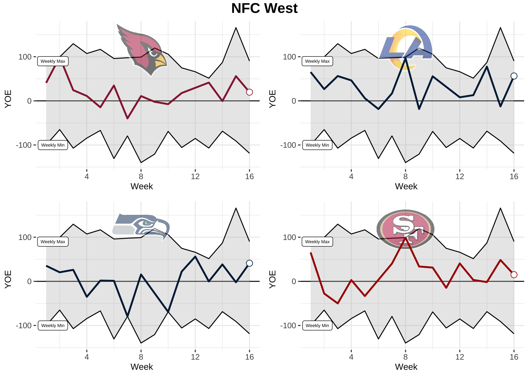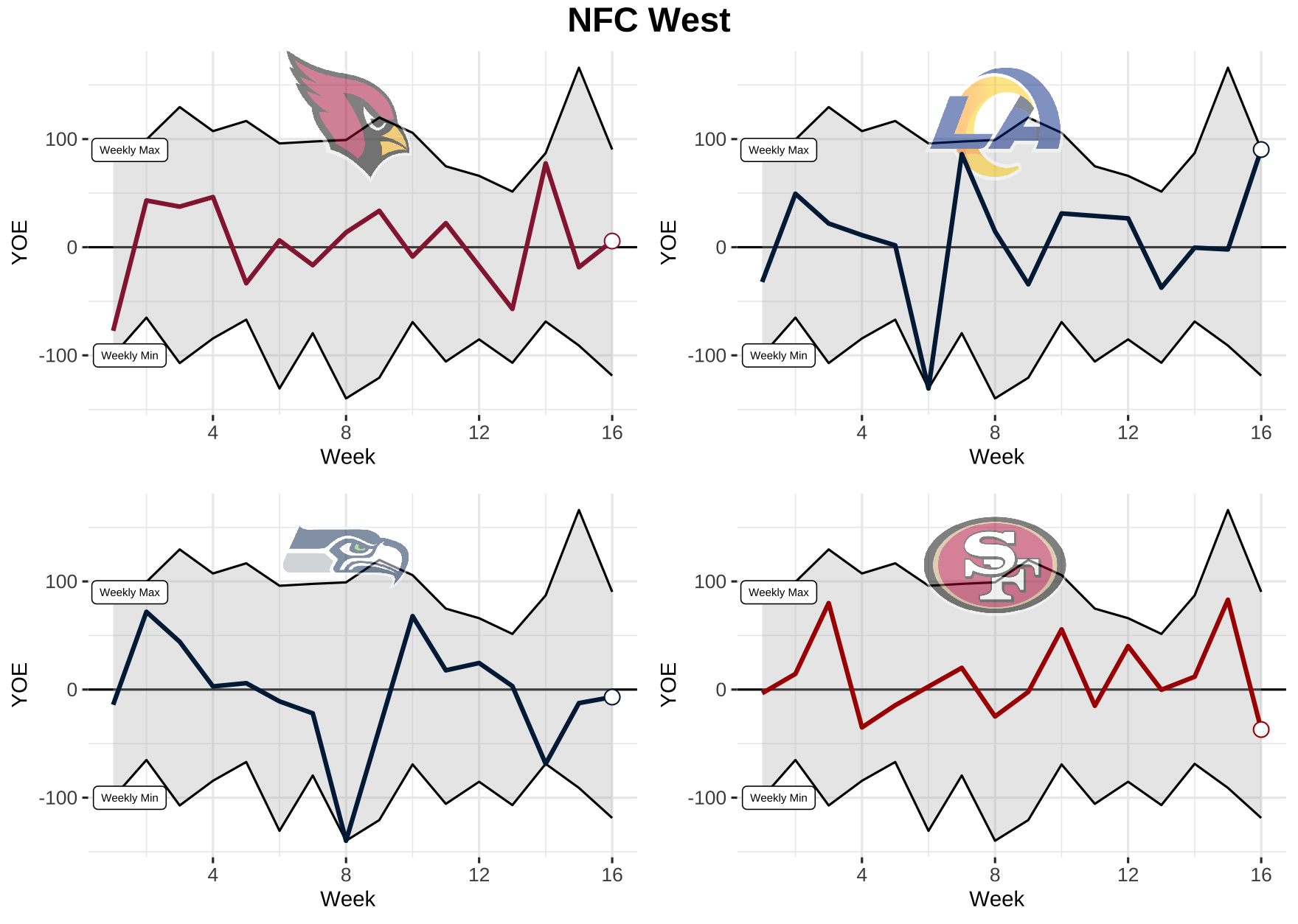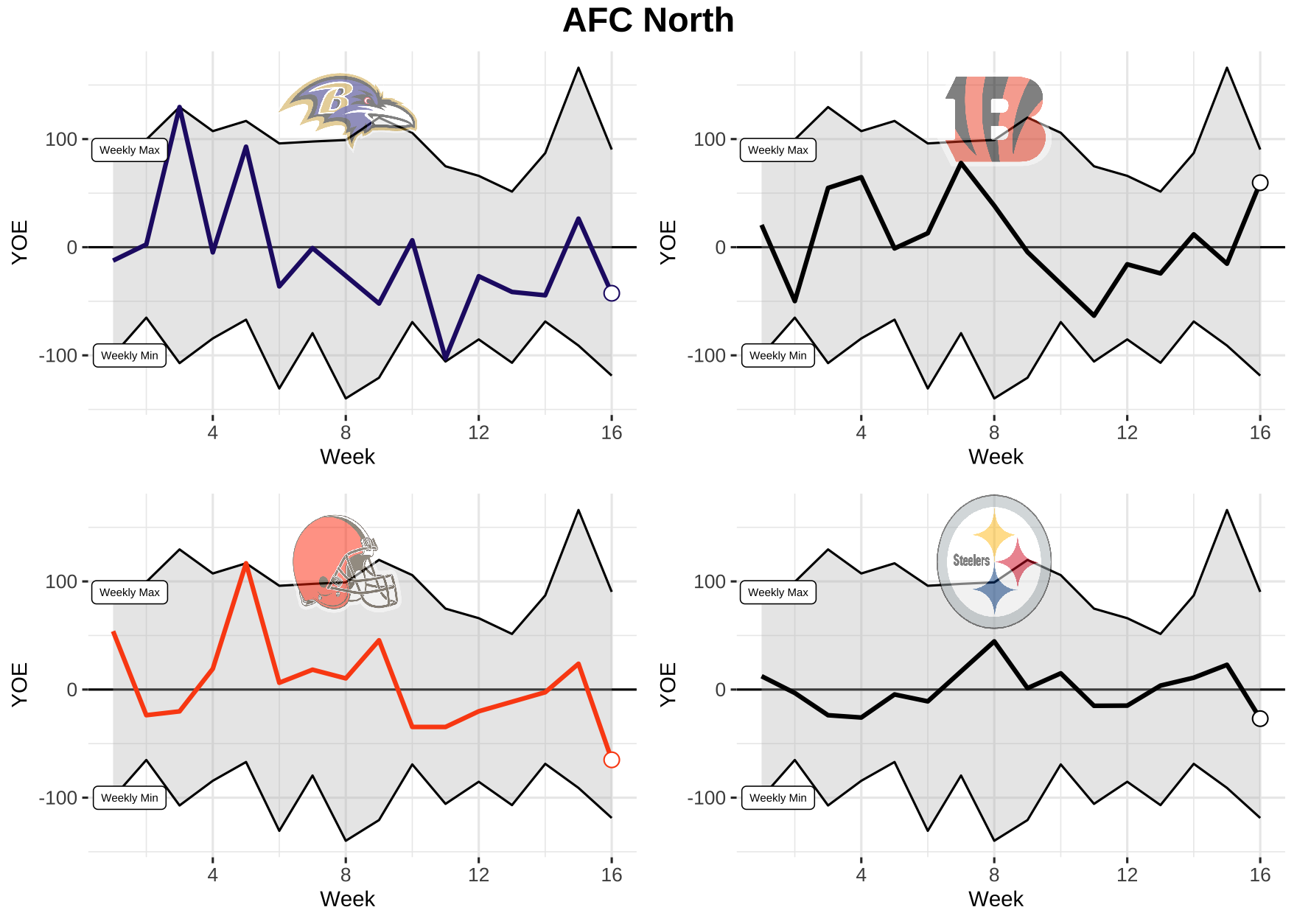 Now that we know what we’re dealing with, let’s take a look at each team’s weekly performance for total YOE from 2021. Keep in mind, the top black line is the max YOE recorded for the week and the bottom is the min. The gray area in between is where every other team falls.