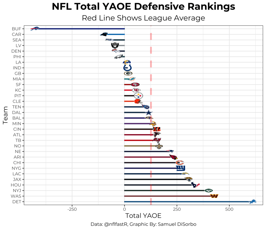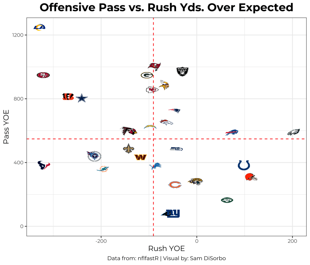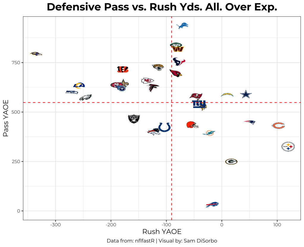 Now let’s take a look at defensive YAOE for the run vs. pass game. Only four teams outperformed the average for YAOE in both the run and pass game–One of these teams made the playoffs. This is an interesting insight and might hint toward the greater importance of having an efficient offense than defense–I might just have to look into this further for a future article!