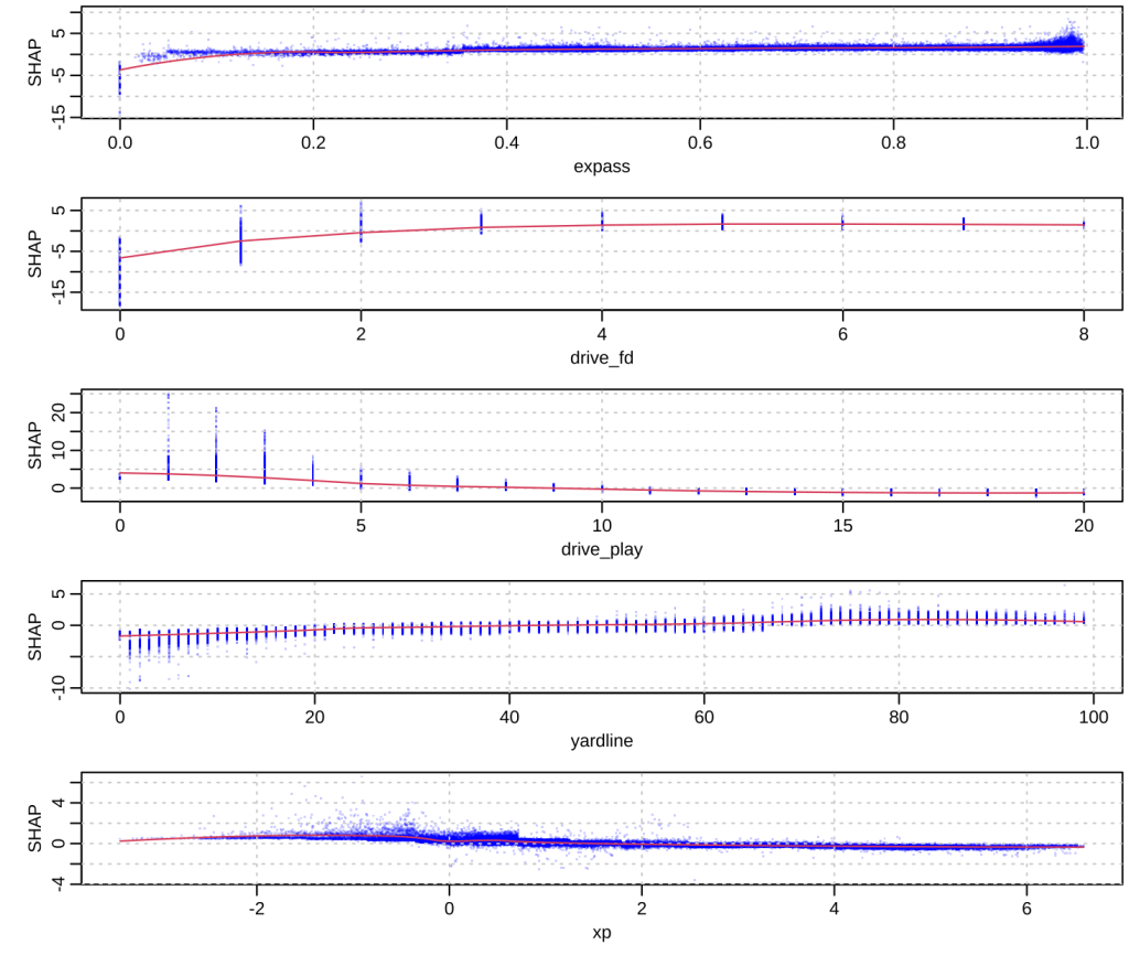 The below SHAP chart shows the top five most influential stats on the model, and how much each data value affected the results (SHAP score; lower means xyards decreased, higher means xyards increased). Expected pass percentage, current drive first downs, drive play number, yard line, and expected points are the most influential stats, respectively.