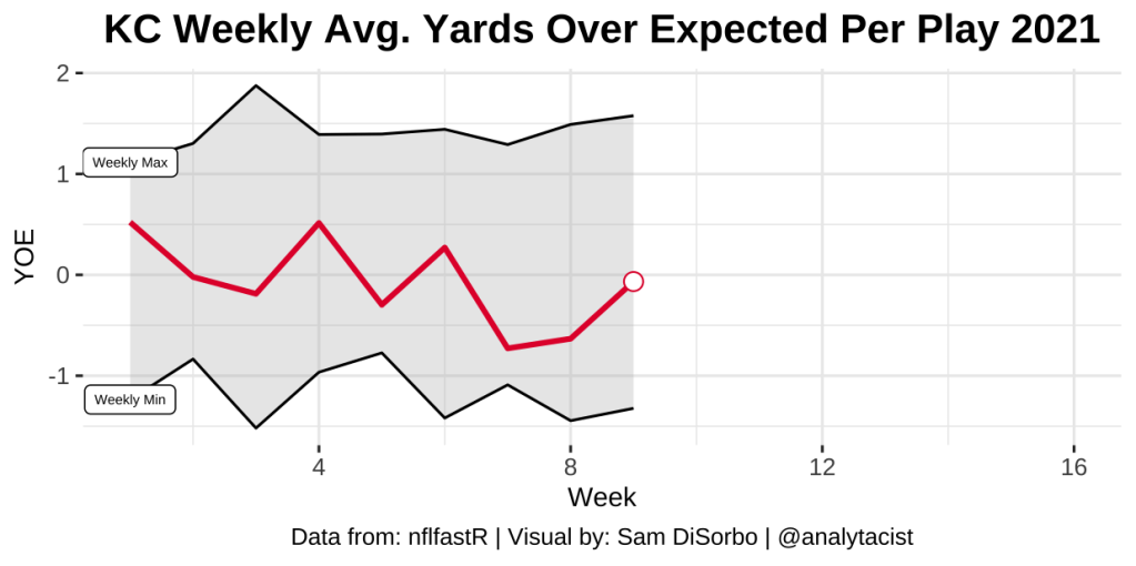 An example of this is shown below: The chart displays the Chiefs’ yards over expected per play through Week 9 of the 2021 season. We can see that they were about average (in between the weekly high and low) each week as they teetered around net 0 YOE/play.