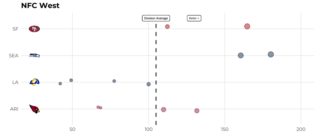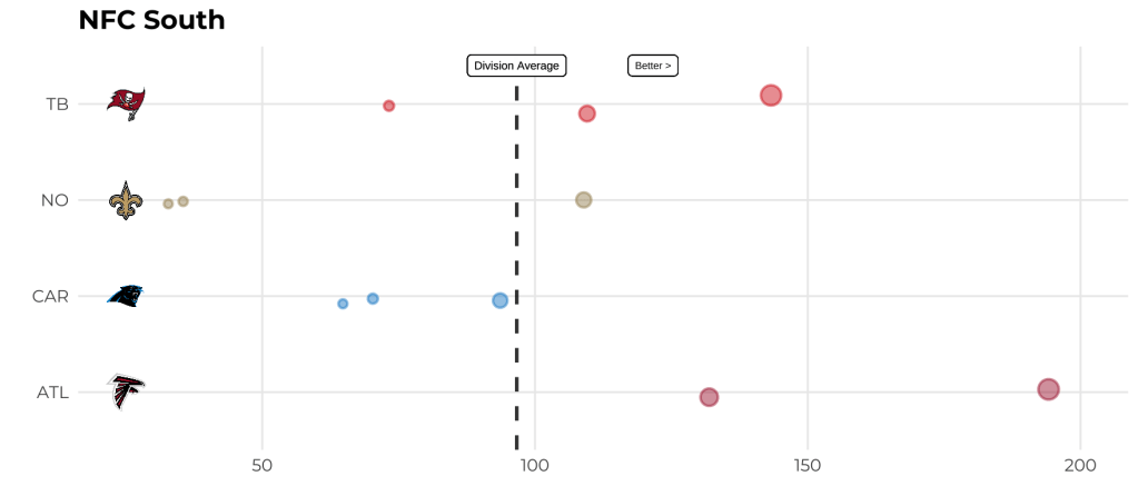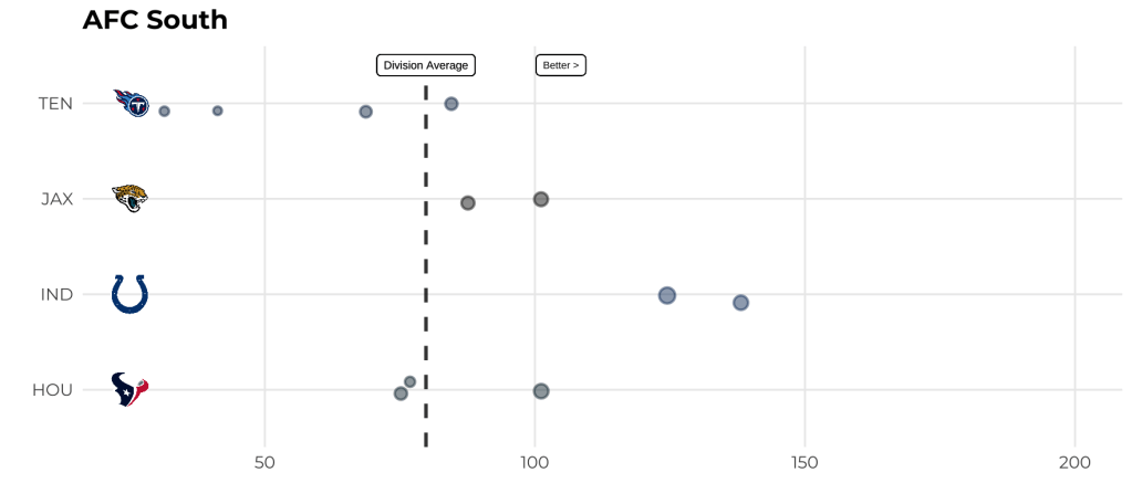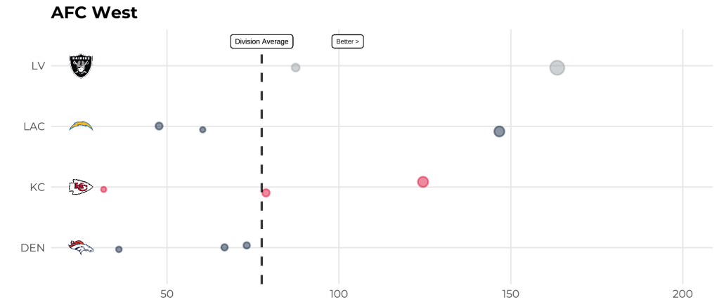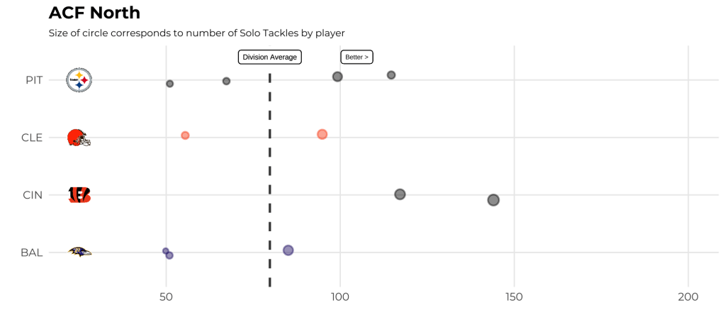 To get us started, let’s take a look at the AFC rankings (each point represents a LB on the team). Some things to note: