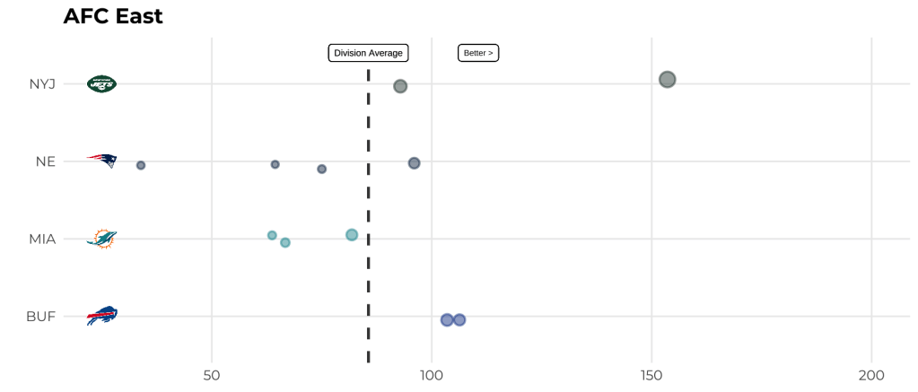 - The AFC East has the highest division average, with the Jets (surprising, right?) and the Bills leading the pack