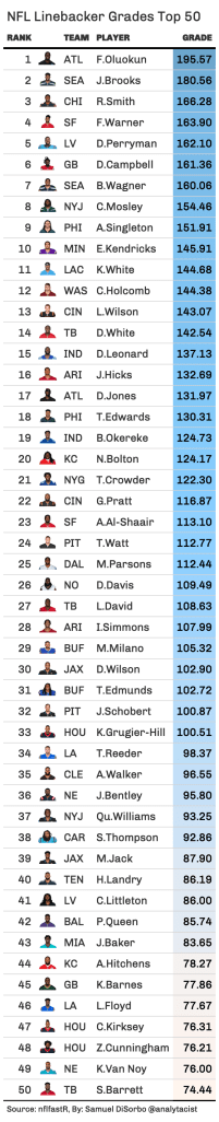 Now let’s take a look at the NFC LB rankings. Some key things to note:
