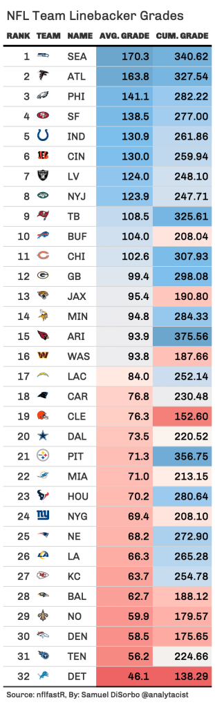 Now, let’s put everything together to look at average team grades and cumulative grades. The Seahawks, led by Bobby Wagner head the top of the list, followed by the Falcons and Eagles which is somewhat of a surprise (the birds take the leaderboard). The Jaguars and Jets also are higher than to be expected–good things to come?